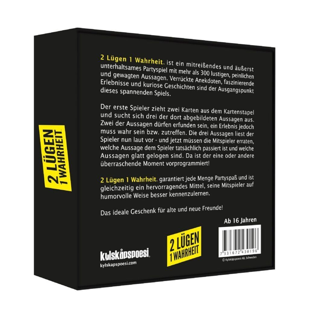 "2 Lügen. 1 Wahrheit" ist ein mitreissendes und äusserst unterhaltsames Partyspiel mit mehr als 300 lustigen, peinlichen und gewagten Aussagen. Verrückte Anekdoten, faszinierende Erlebnisse und kuriose Geschichten sind der Ausgangspunkt dieses spannenden Spiels. Der erste Spieler zieht zwei Karten aus dem Kartenstapel und sucht sich drei der dort abgebildeten Aussagen aus. Zwei der Aussagen dürfen erfunden sein, ein Erlebnis jedoch muss wahr sein oder zutreffen. Die drei Aussagen liest der Spieler nun laut vor - und jetzt müssen die Mitspieler erraten, was dem Spieler tatsächlich passiert ist und welche Aussagen glatt gelogen sind. Da ist der eine oder andere überraschende Moment vorprogrammiert!