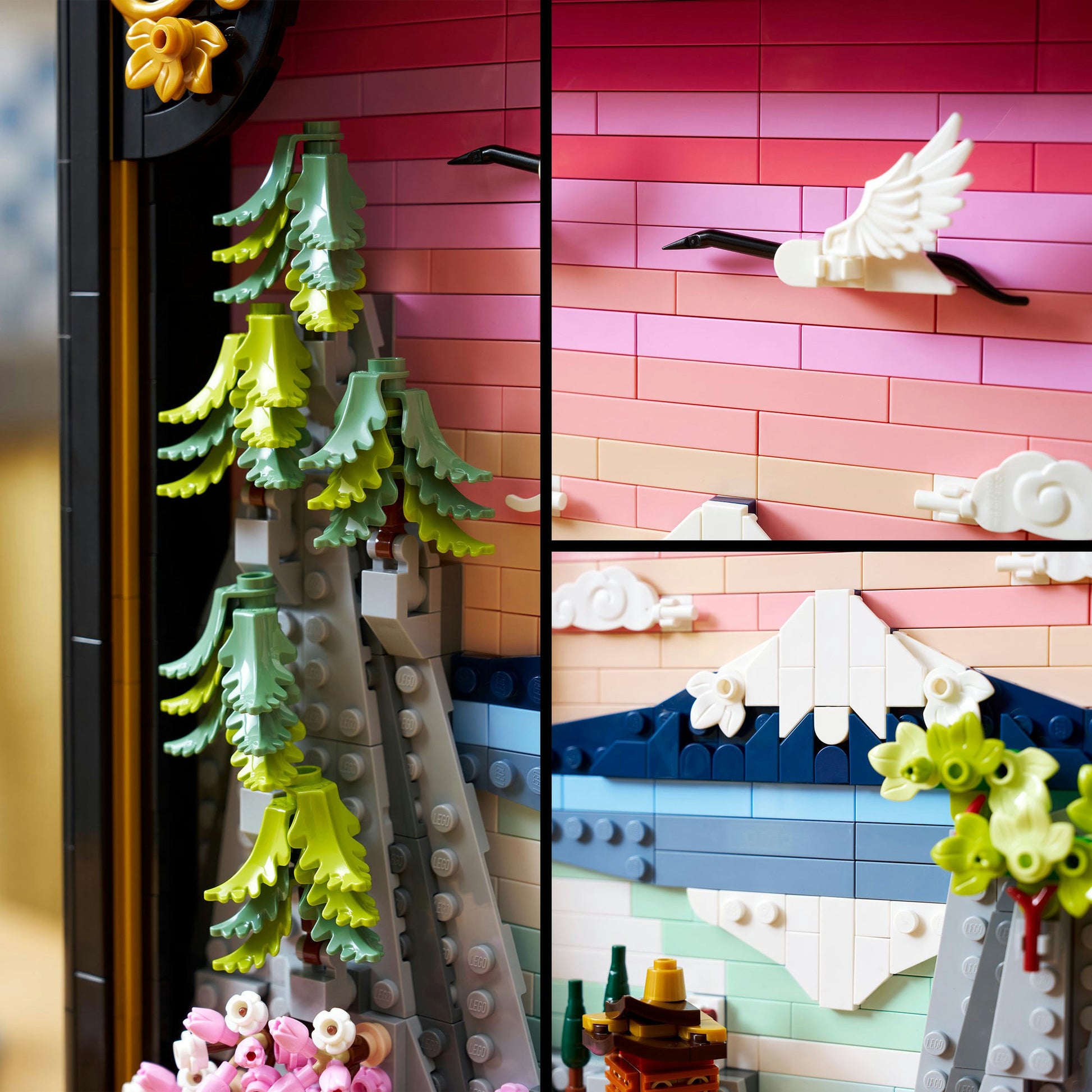 Mit dem LEGO-Set Japanische Kirschblütenlandschaft aus der Serie Art kommt ein Stück fernöstlicher Ruhe nach Hause. Aus 1892 Teilen entsteht ein dreidimensionales Wandbild das von klassischen japanischen Landschaftsmotiven inspiriert ist. Der Blick fällt auf den Fuji, ein traditionelles Teehaus, eine zarte Brücke, fliegende Kraniche, Schirmtannen und natürlich die namensgebenden Kirschblüten. Auch ein Wasserfall, der sich scheinbar über den Rahmen hinaus ergiesst, gehört zu diesem stilvollen Ensemble. Das Set wird von einem schwarzen Rahmen eingefasst und lässt sich sowohl aufstellen als auch aufhängen - je nachdem, wie du es in deine Einrichtung einbinden möchtest. Wer möchte, kann das Bild sogar in zwei unterschiedlichen Varianten gestalten.