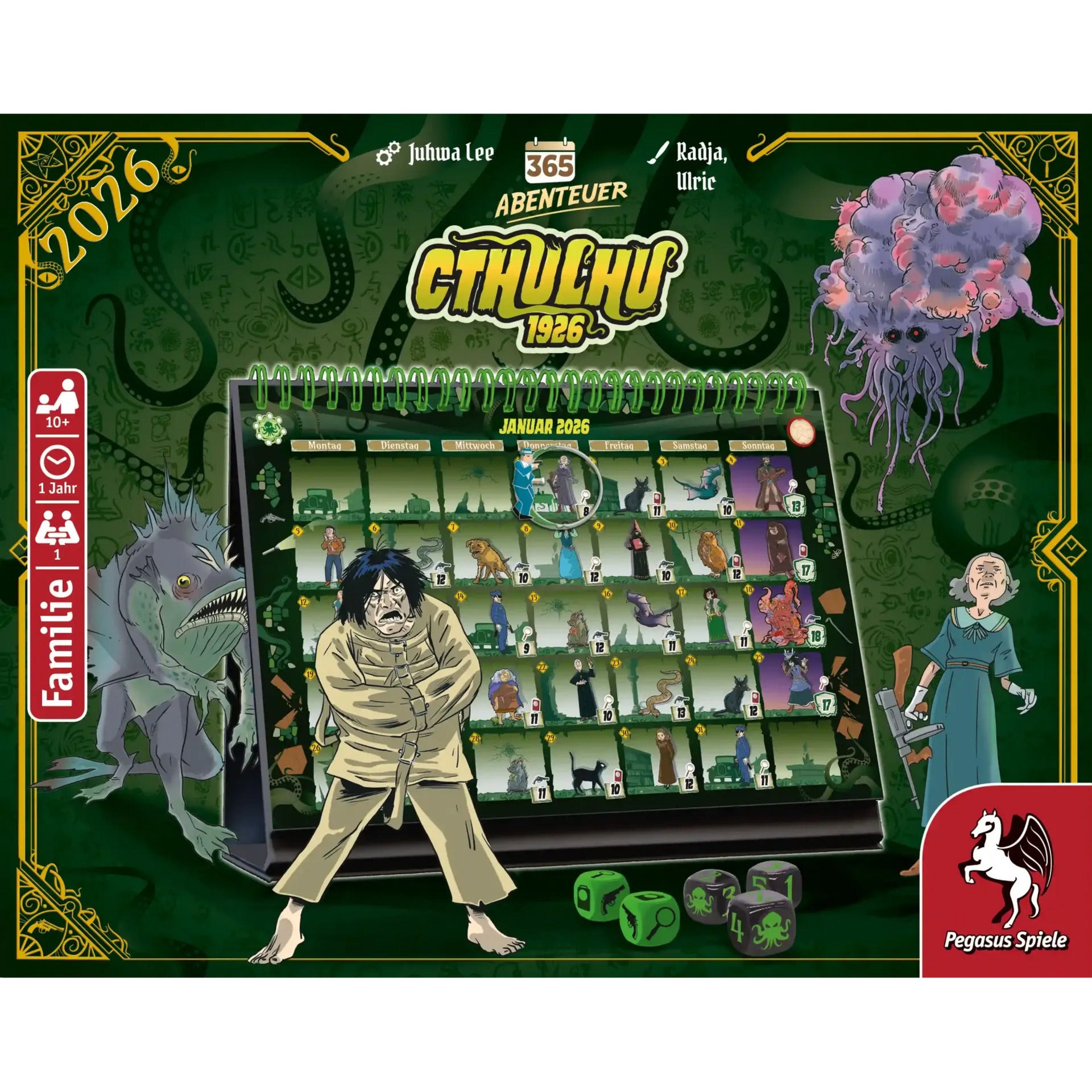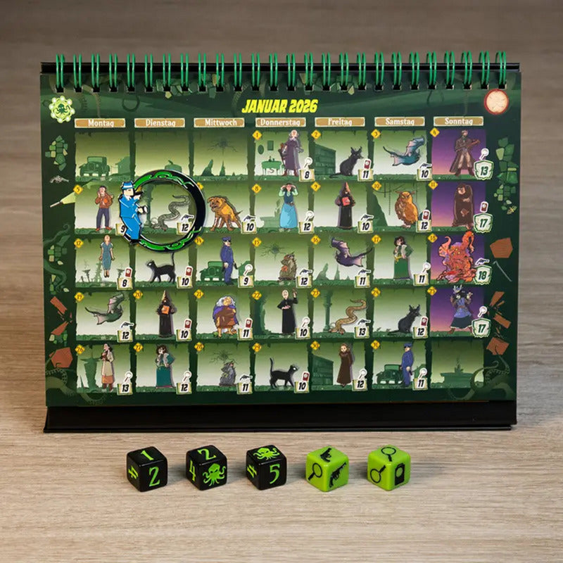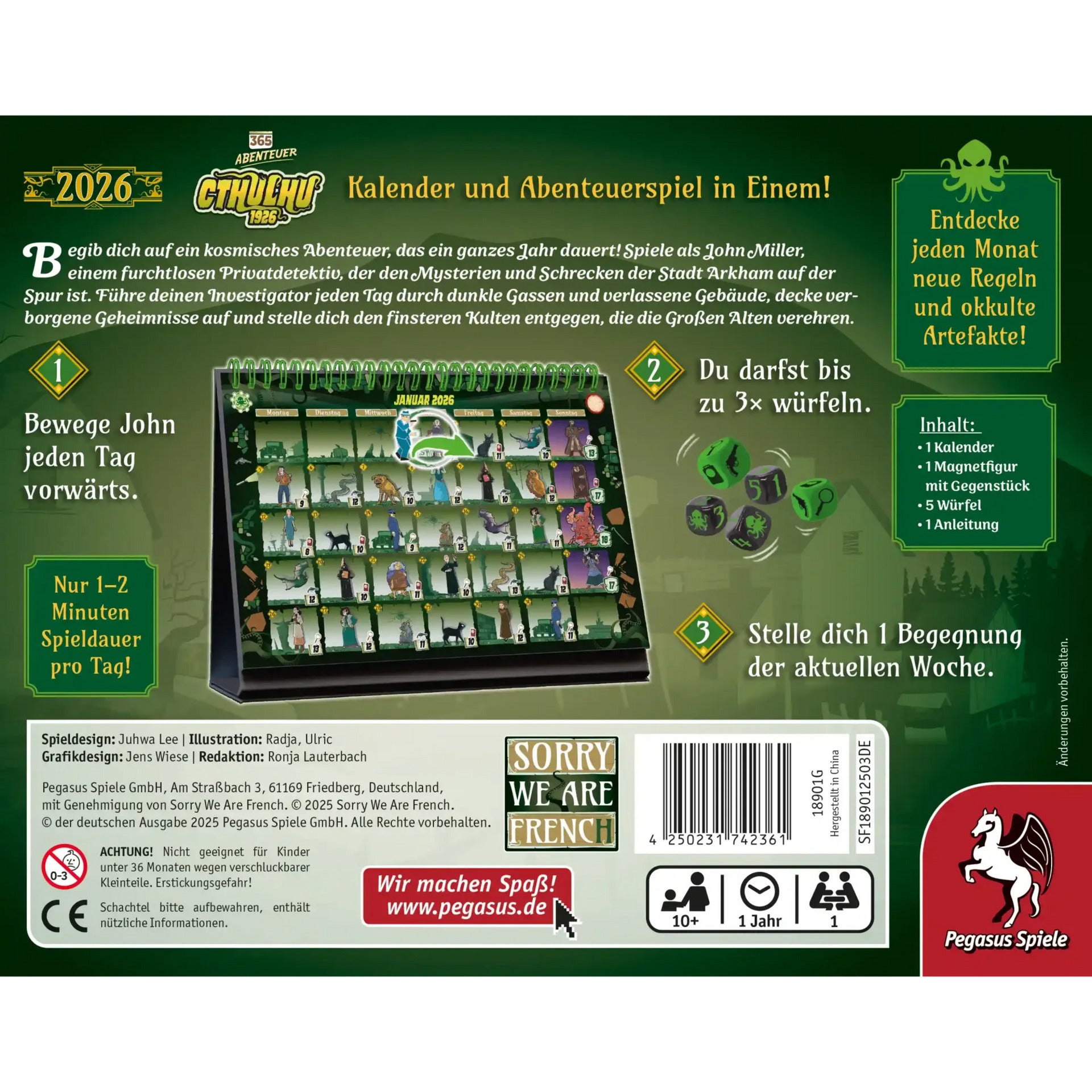 Gerüchte über mysteriöse Kreaturen und dunkle Kulte häufen sich in der rätselhaften Stadt Arkham. Doch der Privatdetektiv John Miller ist bereit, mit Pistole und Taschenlampe in die Dunkelheit einzutauchen und den Geheimnissen auf die Spur kommen. Mit "365 Abenteuer - Cthulhu 1926" schlüpfen die Spielenden für ein ganzes Jahr lang in die Rolle des Privatdetektivs John Miller und begeben sich auf ein kosmisches Abenteuer, das sie in dunkle Gassen und verlassene Gebäude der mysteriösen Stadt Arkham führt. Jeden Tag handeln sie eine neue Begegnung ab und entdecken neue verborgene Geheimnisse um finstere Kulte, die die Grossen Alten verehren. Für jede erfolgreich besiegte Sonderbegegnung am Sonntag gibt es Punkte, aber jeden Tag steigt auch die Wahrscheinlichkeit, wahnsinnig zu werden. Zu Beginn jedes neuen Monats erfahren die Spielenden, wie Johns Geschichte weitergeht. Ausserdem kommen nun auch neue Regeln oder magische Artefakte ins Spiel. Für ihr tägliches Abenteuer brauchen die Spielenden maximal 5 Minuten.