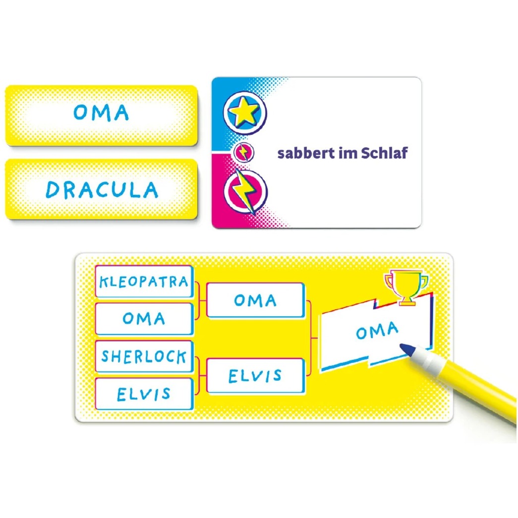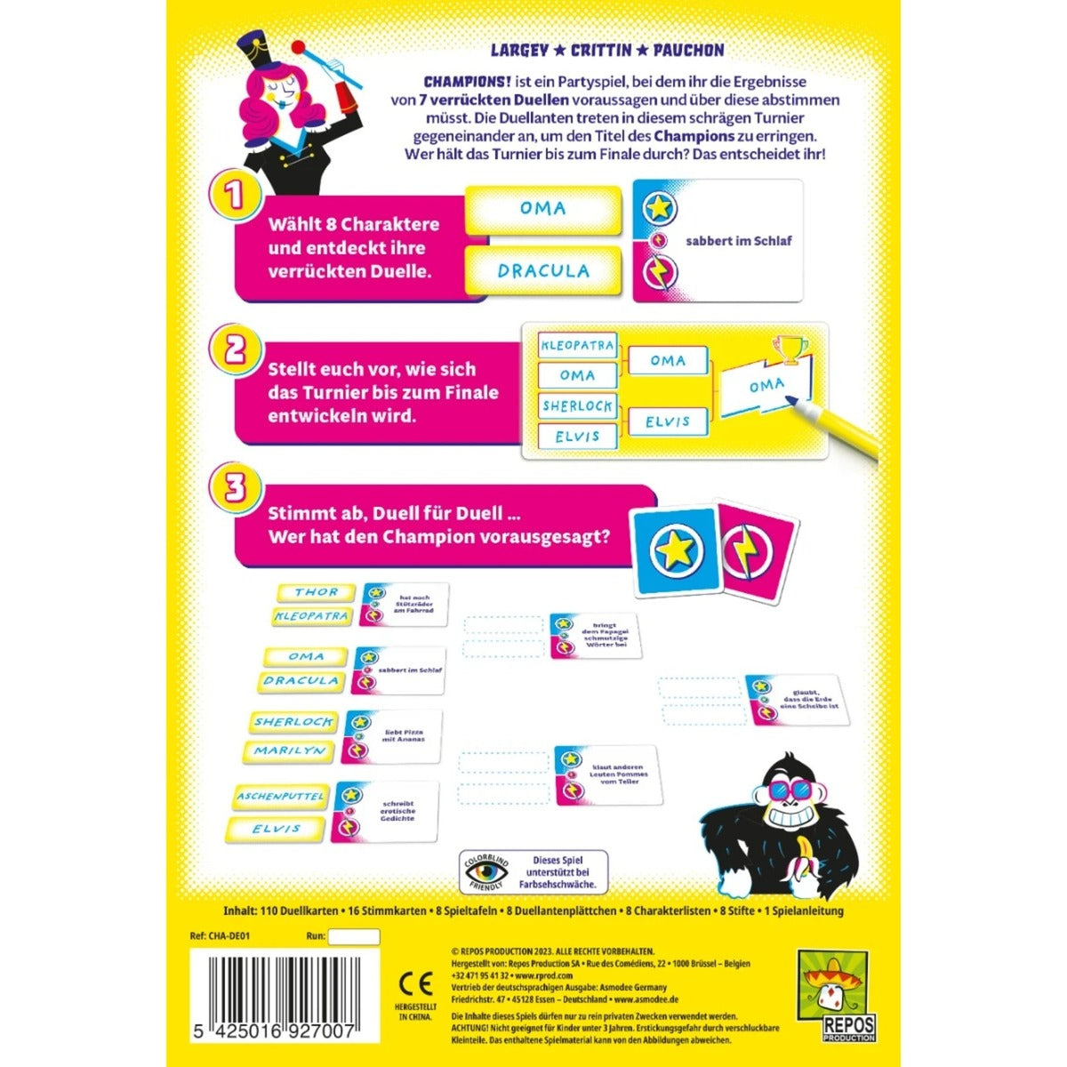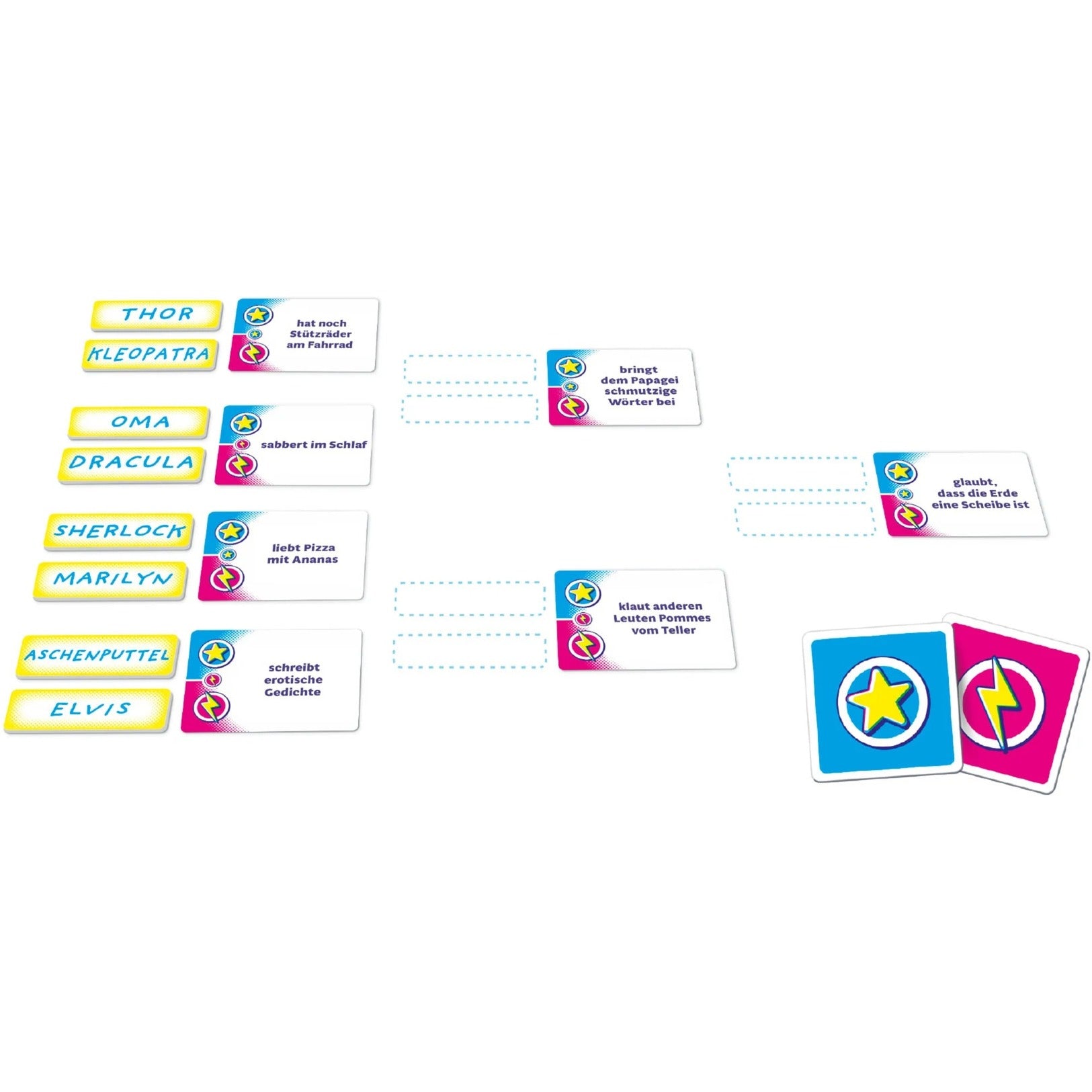 Tretet ein in die Arena der aussergewöhnlichsten Duelle in "Champions!", dem Spiel, das skurrile Vergleiche und urkomischen Spass für eure Spielrunde liefert! Hier trifft Popkultur auf persönliche Anekdoten - seid bereit für Matches, die ihr so schnell nicht vergessen werdet. Jede Runde wählt ihr aus 110 verrückten Duellkarten und lasst Titanen wie Beyoncé und Darth Vader oder sogar eure Oma und Frankensteins Monster in absurden Vergleichen antreten. Eure Vorhersagen treffen auf die Meinungen der Mitspieler, und gemeinsam entscheidet ihr, wer in den einzelnen Duellen die Oberhand gewinnt. Dieses witzgeladene Partyspiel bringt Freunde und Familie zusammen und entfacht hitzige Debatten und herzhafte Lacher, während ihr euch fragt: Wer ist der wirkliche Champion? Perfekt für den Spieleabend, bringt "Champions!" leichten Wettstreit und unendliche Kombinationsmöglichkeiten von Duellen. Legt los und ermittelt durch wilde Vermutungen und ausgelassene Diskussionen, wer in der wilden Welt von "Champions!" das Zeug zum Sieger hat!