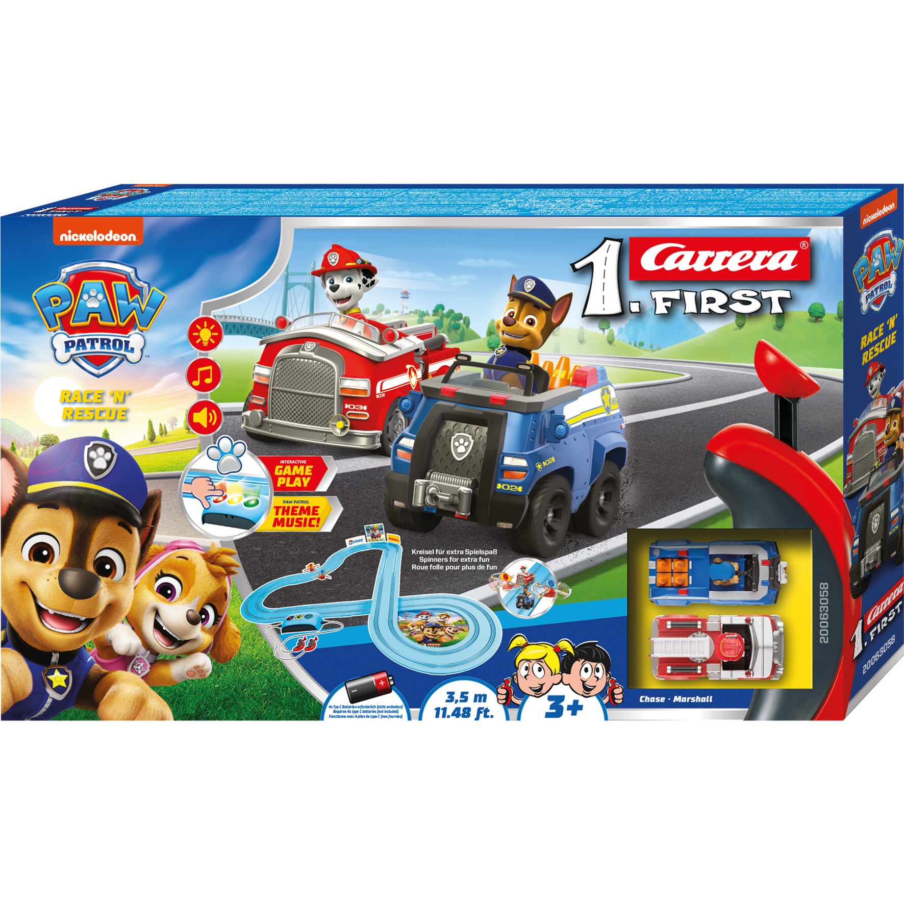 Auf in die Welt der Paw Patrol - mit dieser Carrera-Rennbahn aus der Serie FIRST! Speziell konzipiert für Rennfahrer ab dem Vorschulalter bringt sie Rennspass mit Chase und seinen Freunden direkt ins Kinderzimmer. Mit den originalgetreu gestalteten Fahrzeugen Chase und Marshall können zwei Spieler auf einer 3,5 Meter langen Rennstrecke spannende Duelle austragen. Für grossen Spass sorgt dabei das Licht- und Soundelement und Kreisel auf der Strecke.