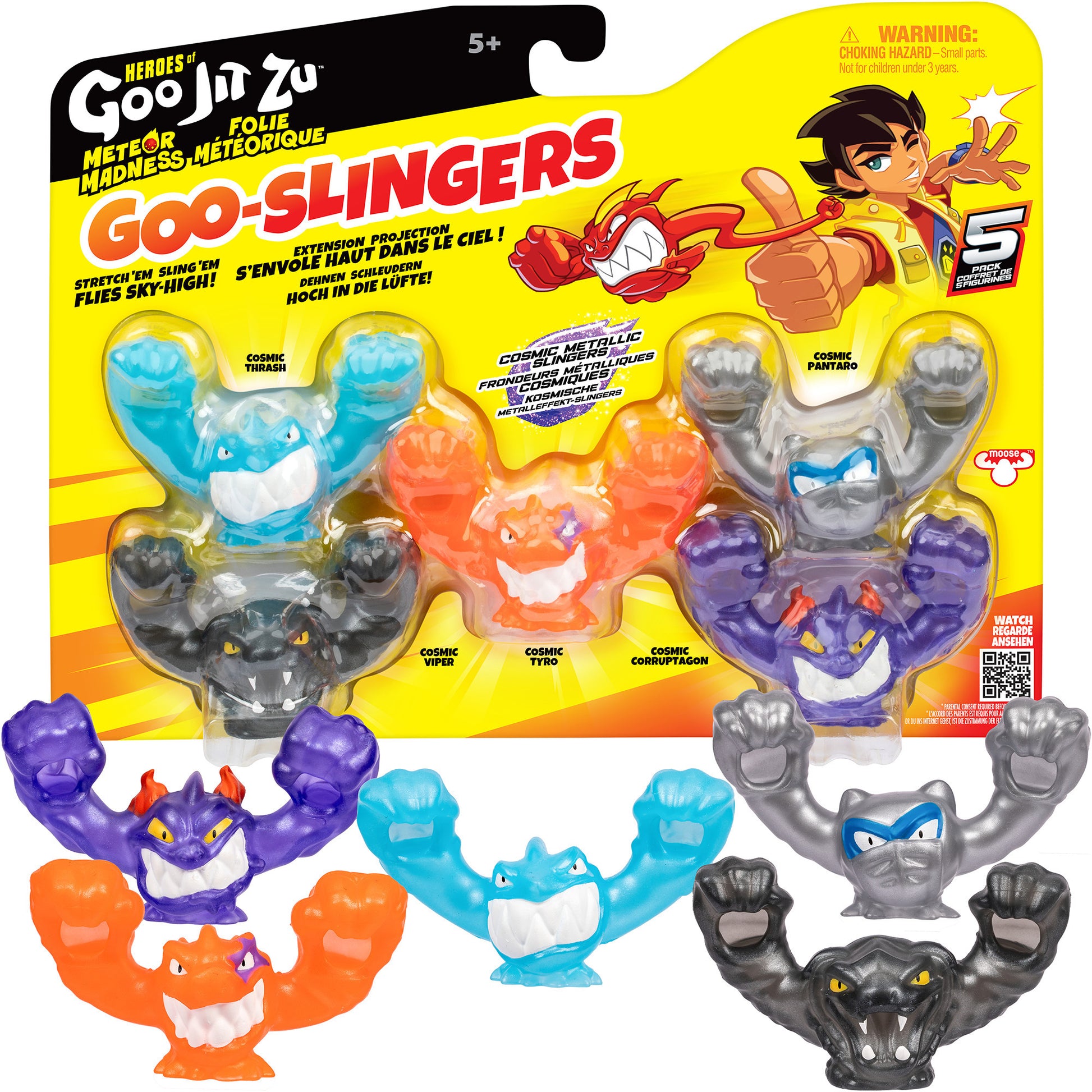 Mach dich auf extreme Dehnbarkeit gefasst - mit den Meteor Madness Goo-Slingers aus der Welt der Goo Jit Zu-Helden von Moose Toys. Sie sind zwar nur 5 cm gross, aber diese Goo-Slingers lassen sich auf bis zu 60 cm dehnen, bevor du sie für epische Luftkämpfe in luftige Höhen katapultierst! Feure sie mit deinen Händen oder dem separat erhältlichen Mega-Werfer ab - was für ein Spass! Diese 5er-Packung enthält 5 epische Helden, die jederzeit bereit sind, sich in den Kampf zu stürzen.