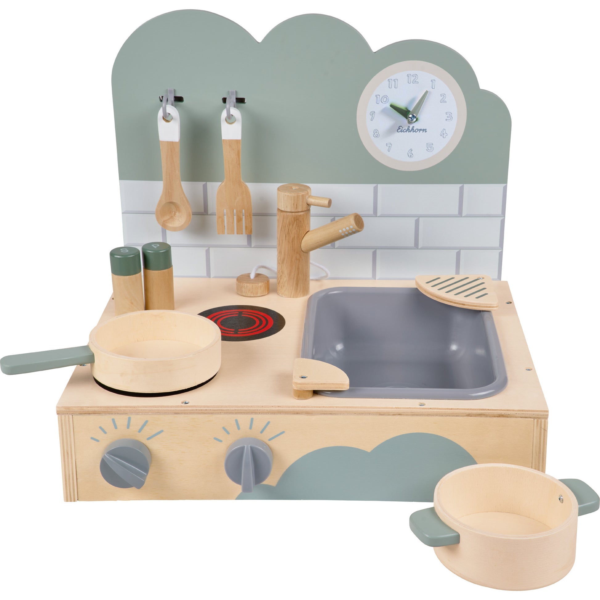 Die kleine Tischküche von Eichhorn bietet mit einem Kochfeld mit Sound und entsprechenden Dreh-Knöpfen mit Klack Funktion, einer Pfanne und einem Topf, einem Spülbecken mit Wasserhahn, Kochlöffel und Pfannenwender, Salz- und Pfefferstreuer, und einer verstellbaren Uhr, alles was kleine Köche oder Köchinnen benötigen. Aufgebaut hat die Spielküche eine Grösse von 40 x 35 x 31 cm. Für Kinder ab 3 Jahren geeignet.
