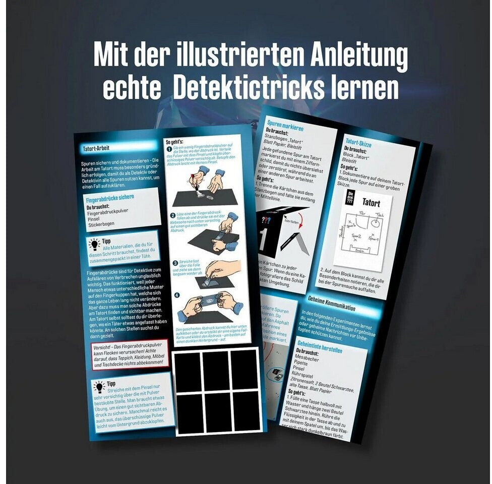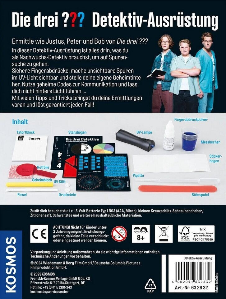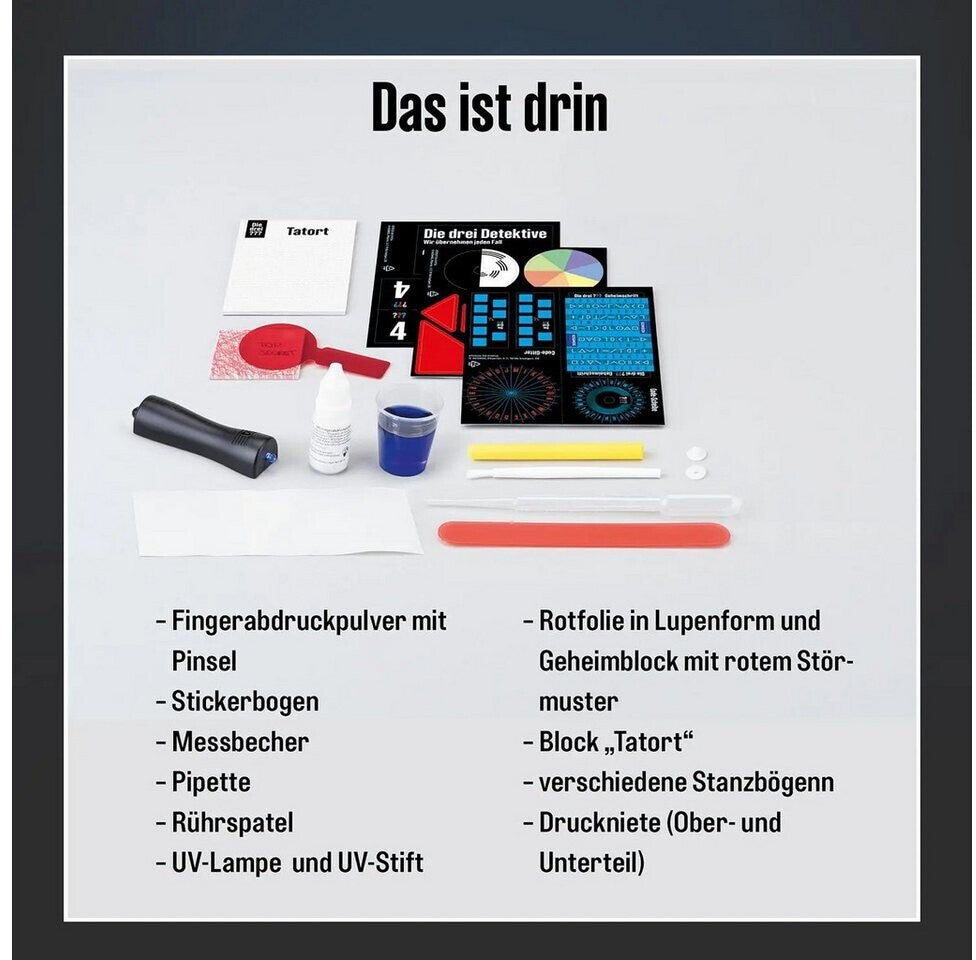 Mit dieser Detektiv-Ausrüstung rätselhafte Fälle lösen wie Justus, Peter und Bob im Film "Die drei ??? und der Karpatenhund"! Nachwuchs-Detektive und Kino-Fans brauchen das richtige Werkzeug, um knifflige Kriminalfälle zu lösen, Beweise zu sichern, Fingerabdrücke sichtbar zu machen und geheime Botschaften zu entschlüsseln. Mit der UV-Lampe bleibt am Tatort nichts mehr verborgen. Wertvolle Tipps und Detektiv-Wissen gibt es in der Anleitung. Mit diesem Grundausstattungs-Set für Einsteiger machen Kinder den ersten Schritt zum Profi-Ermittler und lösen das Rätsel um den verschwundenen Karpatenhund!