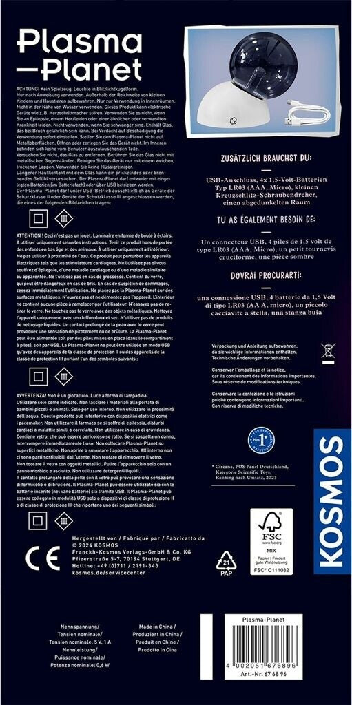 Taucht ein in das faszinierende Universum der Physik mit dem "Plasma Planet" von KOSMOS! Dieser Klassiker unter den Science-Spielereien ist ein Muss für jeden Wissenschaftsbegeisterten und schafft mit seinen rötlich-violetten Blitzen eine geheimnisvolle Atmosphäre im Zimmer jedes Teenagers. Die 12 cm grosse, transparente Kugel reagiert auf Berührungen und lässt die farbenprächtigen Lichtstrahlen auf euer Kommando tanzen. Noch verblüffender: Dank des eingebauten Soundsensors interagieren die Blitze mit Umgebungsgeräuschen und pulsieren im Rhythmus eurer Lieblingsmusik - Physik, die auf Sound reagiert! Die Wissenschaft dahinter wird in der anschaulichen Anleitung erklärt, die in die Welt der Elektrizität und Edelgase entführt. "Plasma Planet" ist ein hypnotisierendes Spektakel und das Highlight für jedes Jugendzimmer.100050715