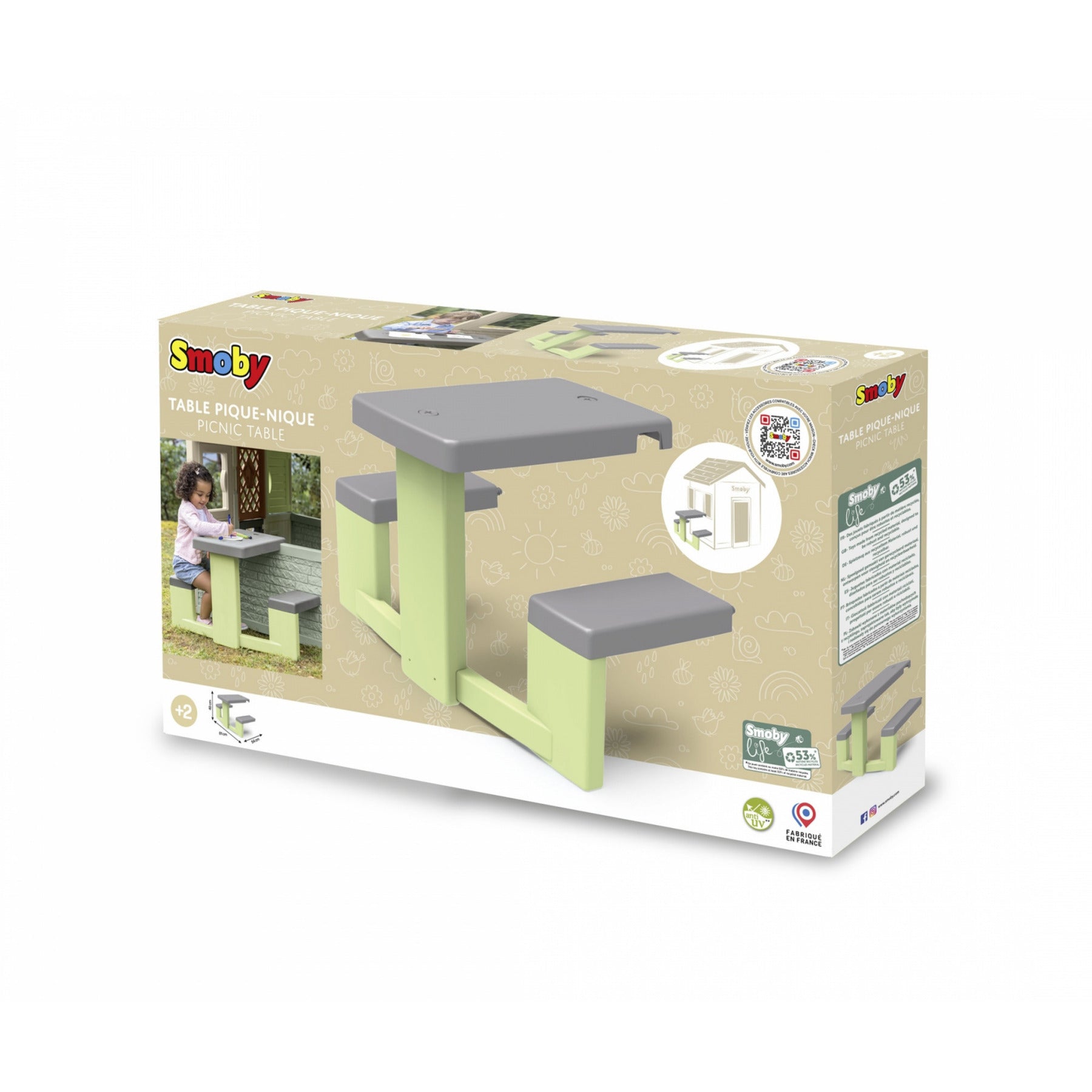Mit dem Life Spielhaus Zubehör Picknicktisch von Smoby kommt der perfekte Kinder-Spieltisch in den Garten. Diese clevere Ergänzung für Smoby-Spielhäuser schafft Fläche für kreatives Spielen. Ausgestattet mit zwei stabilen Sitzbänken bietet der Tisch Platz für Mahlzeiten, Spielpausen oder spannende Rollenspiele mit Freunden. Kinder können spielerisch das Tischdecken üben, Speisen servieren und gesellig zusammenkommen. Gefertigt mit einem höhen Anteil aus recyceltem Kunststoff und UV-beständig behandelt ist der Tisch nicht nur nachhaltig, sondern auch ideal für den langfristigen Einsatz im Freien geeignet. Selbst bei intensiver Sonneneinstrahlung bleibt die Farbqualität erhalten, so dass der Picknicktisch viele Jahre Freude bereitet.