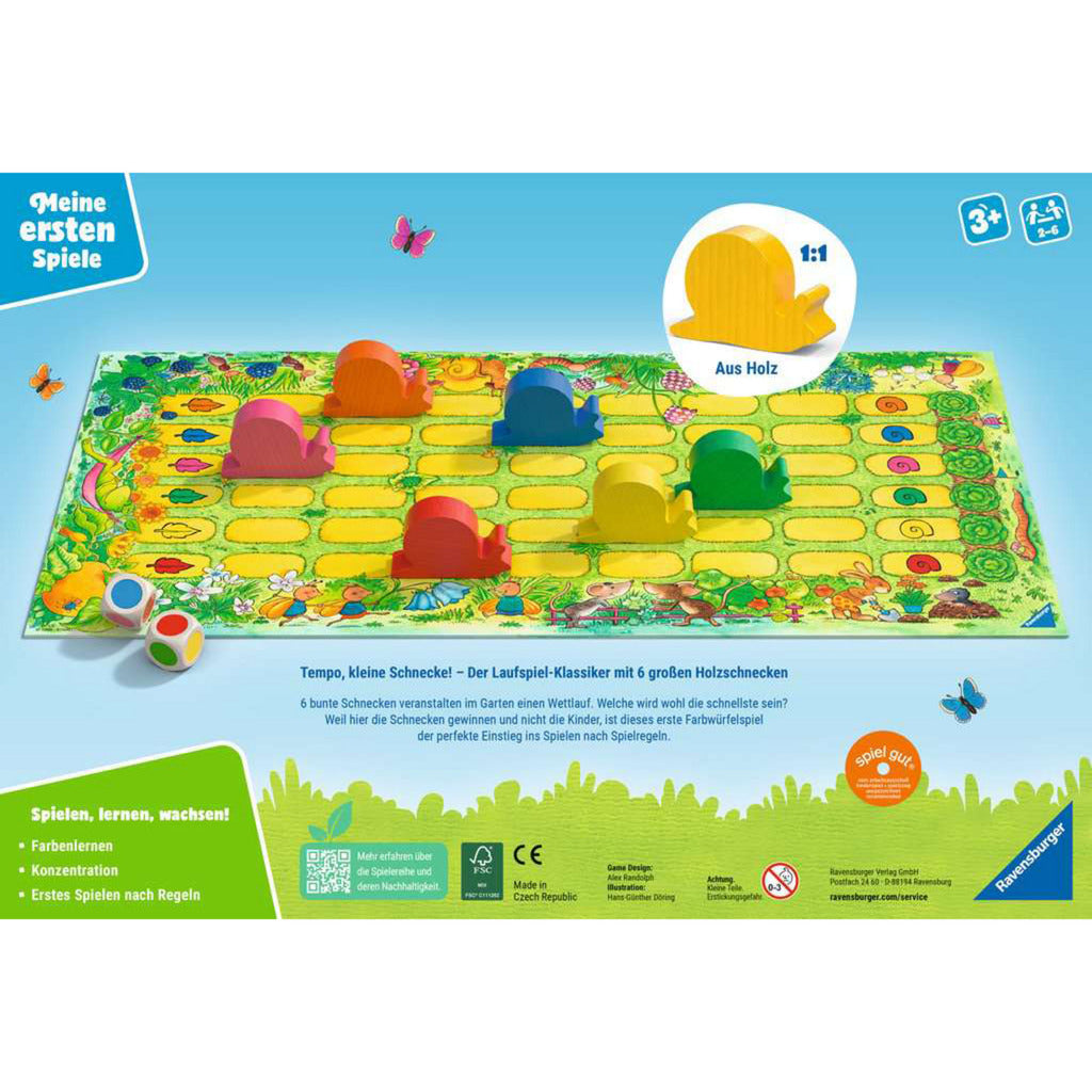 Auf die Plätze, Schnecken – los! Wer hat beim Rennen zu den grünen Salatköpfen die Fühler vorn? Der Spieler, der an der Reihe ist, würfelt mit beiden Farbwürfeln und zieht die passenden Schnecken jeweils ein Feld vor. Jetzt die Würfel an den nächsten Spieler geben, und schon geht der Wettlauf weiter. Das Spiel ist zu Ende, wenn eine Schnecke bei den Salatköpfen ankommt. Diese Schnecke hat gewonnen und darf sich satt fressen. "Tempo, kleine Schnecke!" ist ein Klassiker von Ravensburger und enthält in dieser Version 6 hochwertige Holzschnecken als Spielmaterial. Die Spiele aus der Reihe "Meine ersten Spiele" sind mit besonders dickem und griffigem Material ausgestattet und gezielt auf die Bedürfnisse und Fähigkeiten von Klein- und Vorschulkindern ausgerichtet.