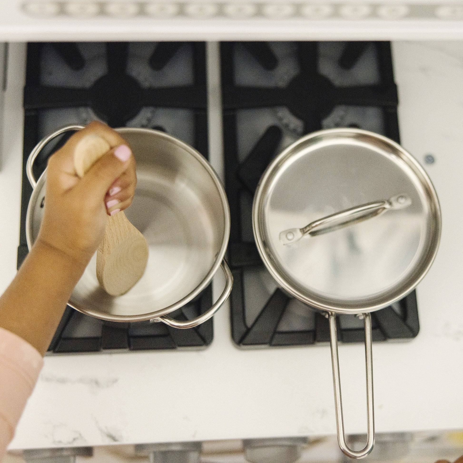 Für eine perfekt ausgestattete Spielküche und realistisches Rollenspiel steht dieses Topfset von Spin Master Melissa & Doug! Es enthält ein Salatsieb, einen Topf mit Deckel, eine Kasserole, eine Pfanne und zwei Küchenutensilien aus Holz sowie ein kleines Regal. Die Spielzeug-Geschirrteile bestehen aus rostfreiem Stahl, die Griffe sind feste vernietet und spülmaschinengeeignet.