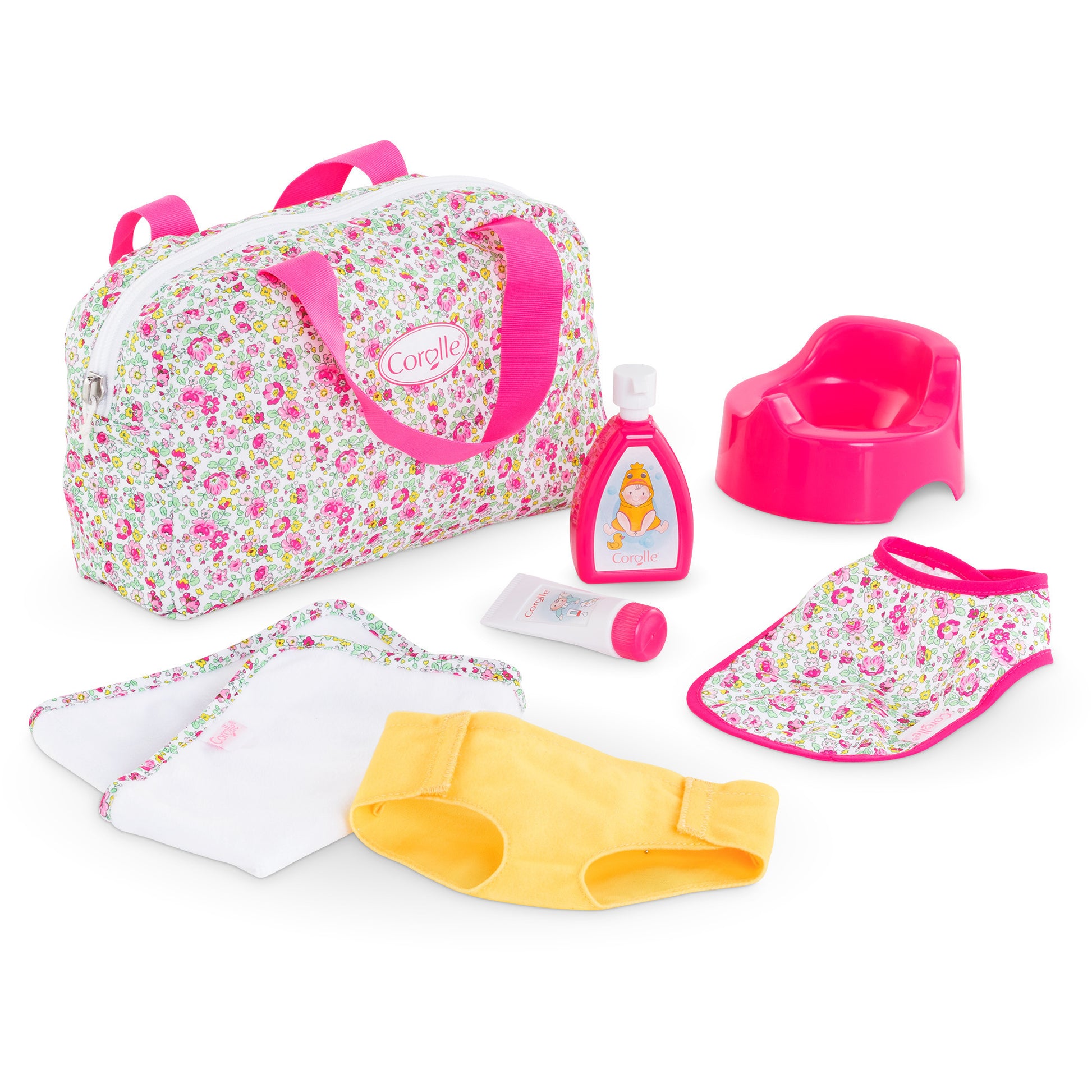 Dieses süsse 7-teilige Mon Grand Poupon Wickelset bestehet aus einer Wickeltasche, einer Wickelunterlage, einer Windel, einer Creme, einer Bodylotion, einem Töpfchen und einem Lätzchen. Es ist passend für alle 36-42 cm grossen Corolle Babypuppen und für Kinder ab 2 Jahren geeignet.