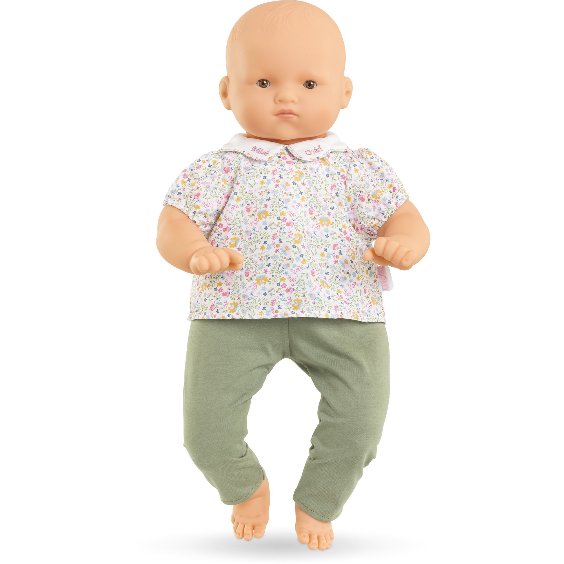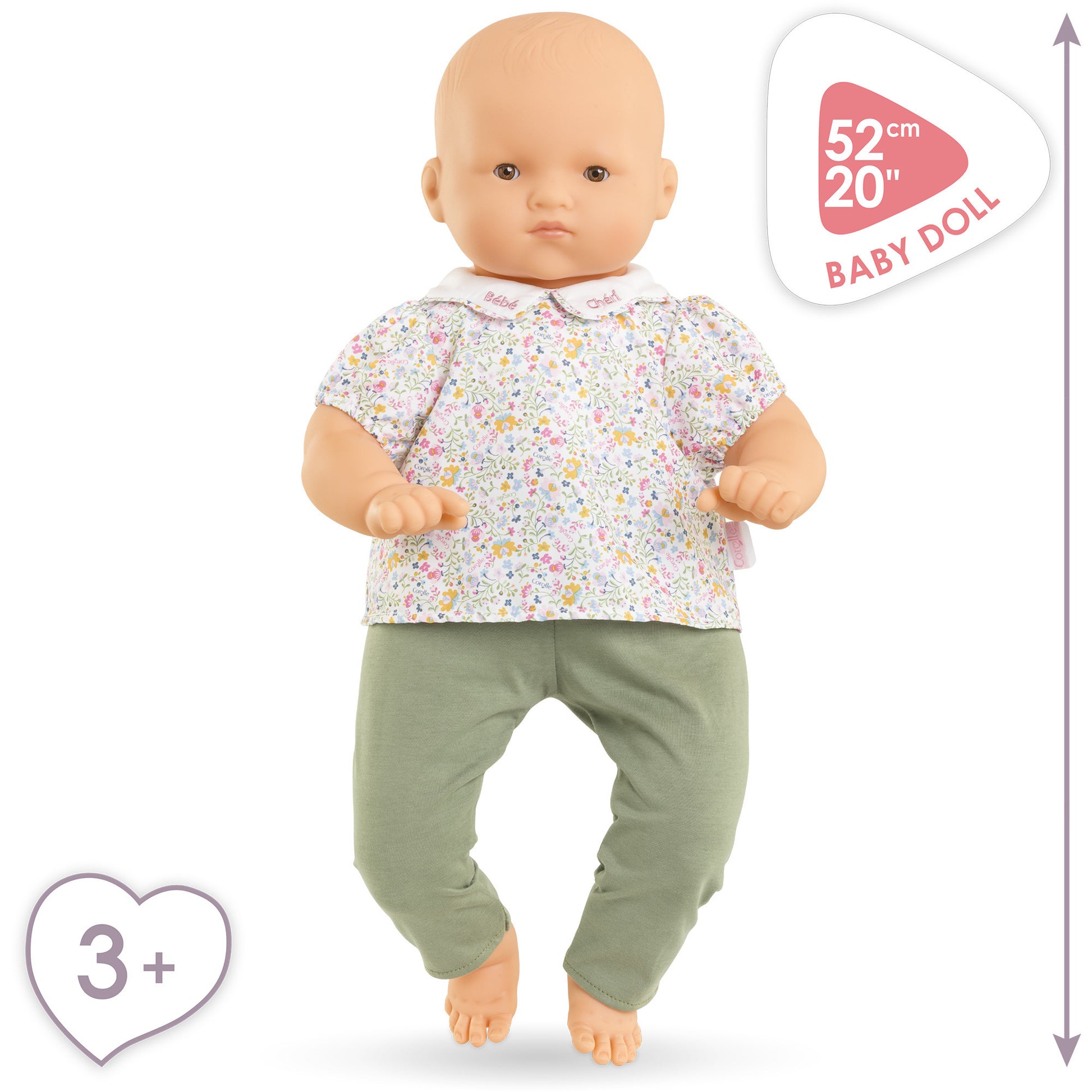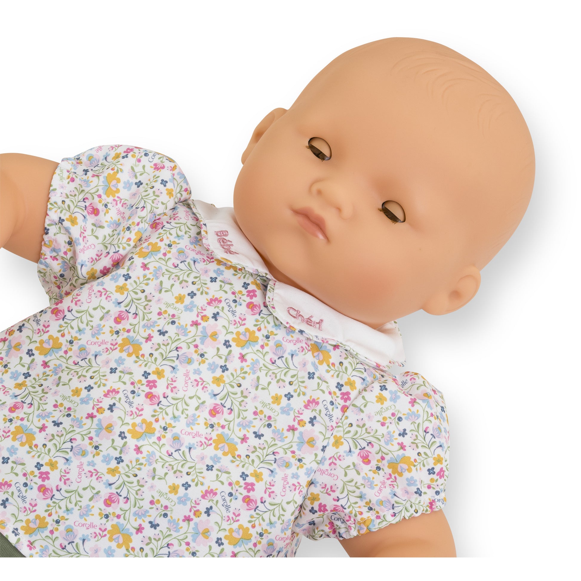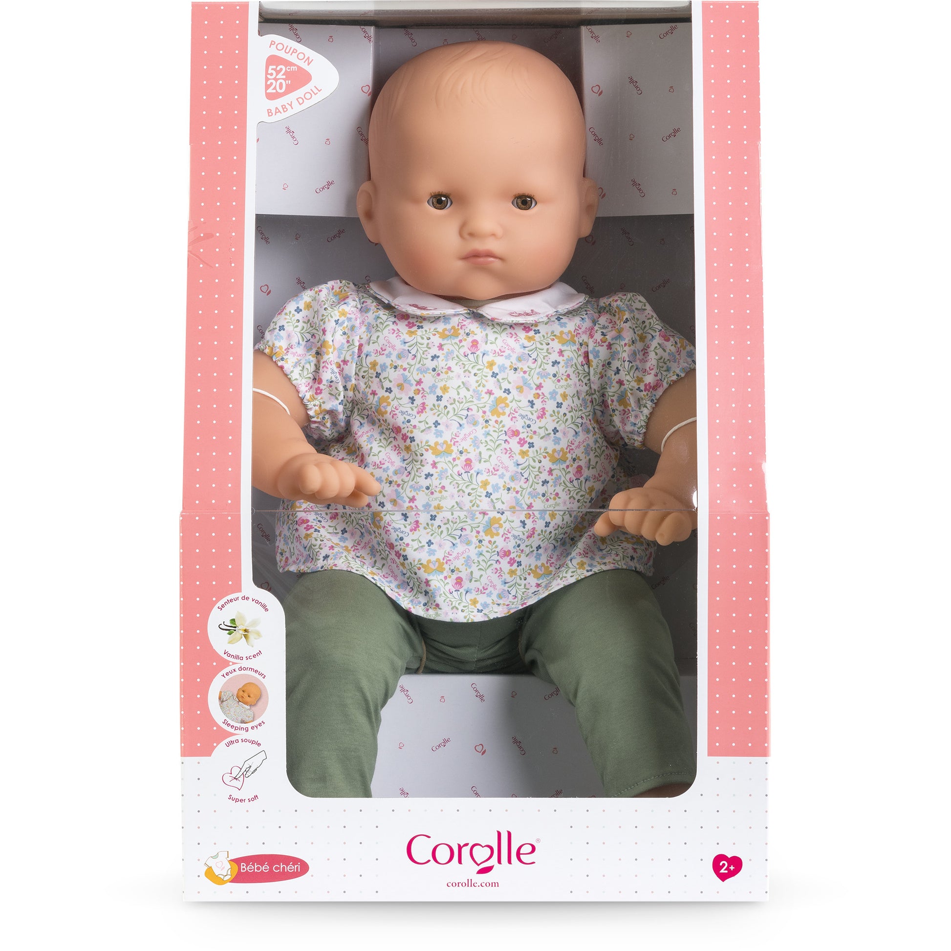 Die Puppen der Serie "Mon Grand Poupon" von Corolle sind auf die Bedürfnisse von Kindern abgestimmt, die als Puppeneltern spielerisch mehr Aufgaben übernehmen wollen. Kinder lieben es in die Rolle der Eltern zu schlüpfen. Jetzt heisst es füttern, Windeln wechseln oder ein Bad nehmen. Chéri ist 52 Zentimeter gross und trägt ein geblümtes Oberteil mit schicker olivgrüner Hose. Diese Babypuppe hat Schlafaugen und verströmt einen angenehmen Vanilleduft.