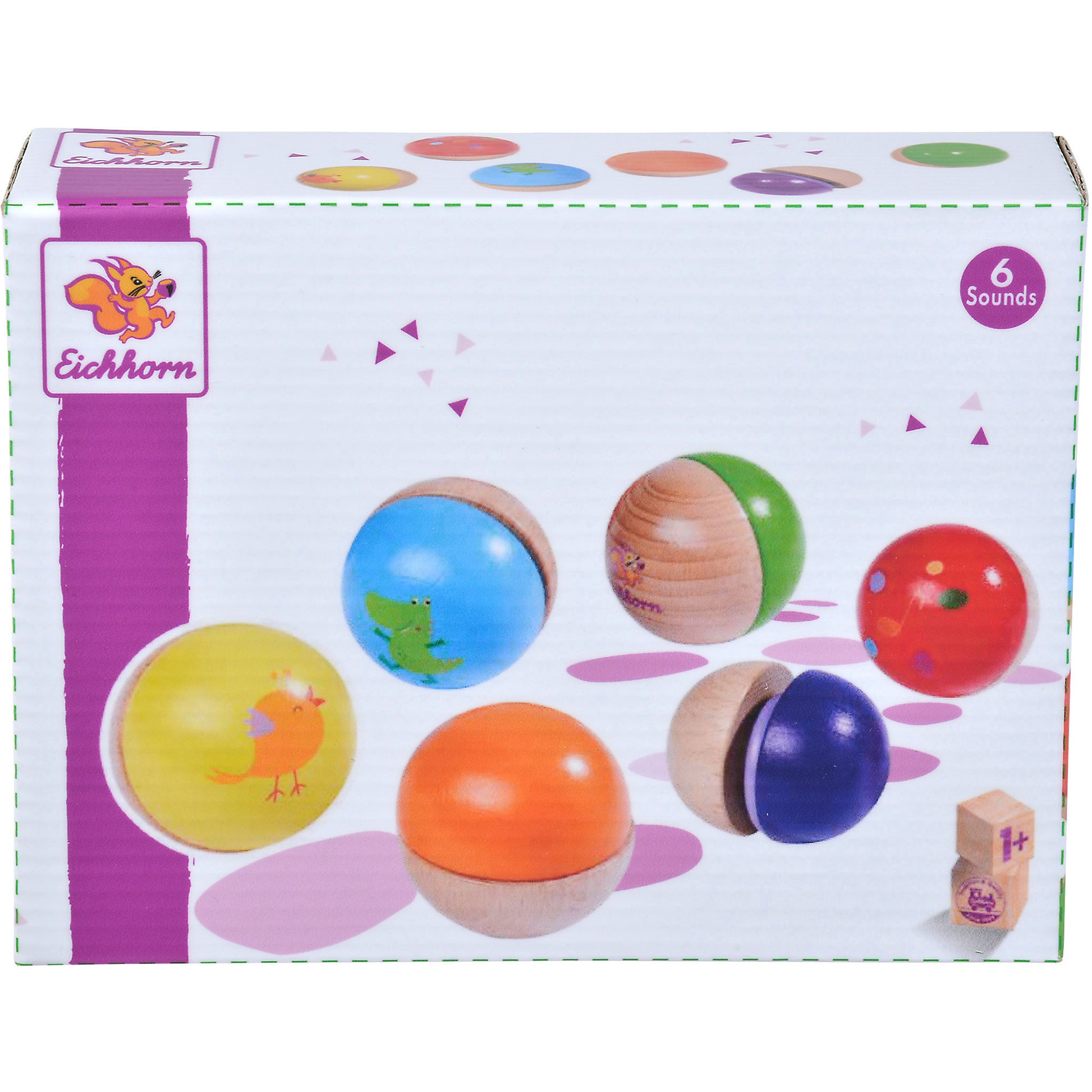Die sechs bunt gestalteten Sound Kugeln von Eichhorn machen sechs verschiedene Sounds. Diese sind mit Kügelchen, einem Glöckchen oder anderen Dingen bestückt. Dadurch wird die Akustik, die Motorik und die Hand-Augen-Koordination des Kindes gezielt gefördert und geschult. Für Kinder ab einem Jahr geeignet.