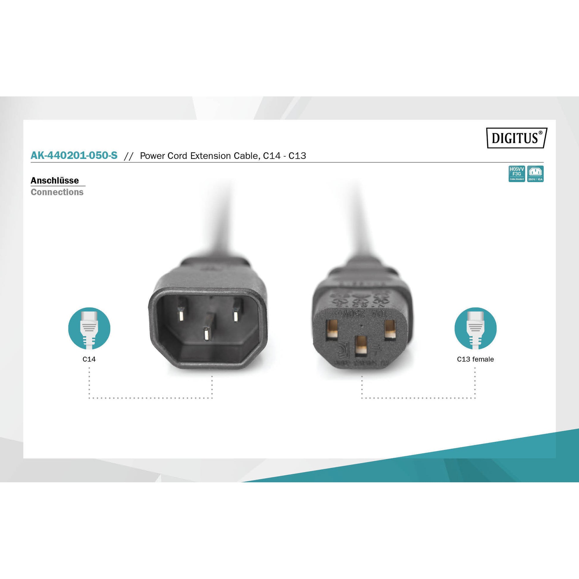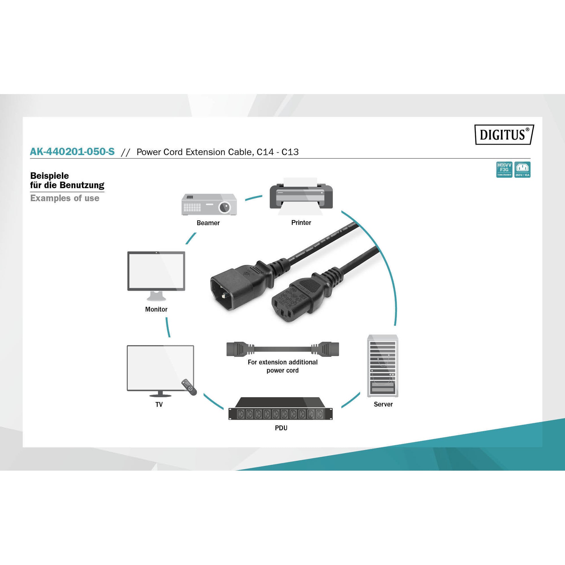 Das Netzkabel AK-440201-050-S von DIGITUS, mit IEC C14 Stecker und IEC C13 Buchse, auch als Kaltgeräte-Verlängerungskabel bekannt, dient zur Verbindung zwischen PC-Netzteil und Monitor, wodurch eine Steckdose zur Stromversorgung weniger benötigt wird. Ausserdem kann es als Verlängerungskabel genutzt werden.