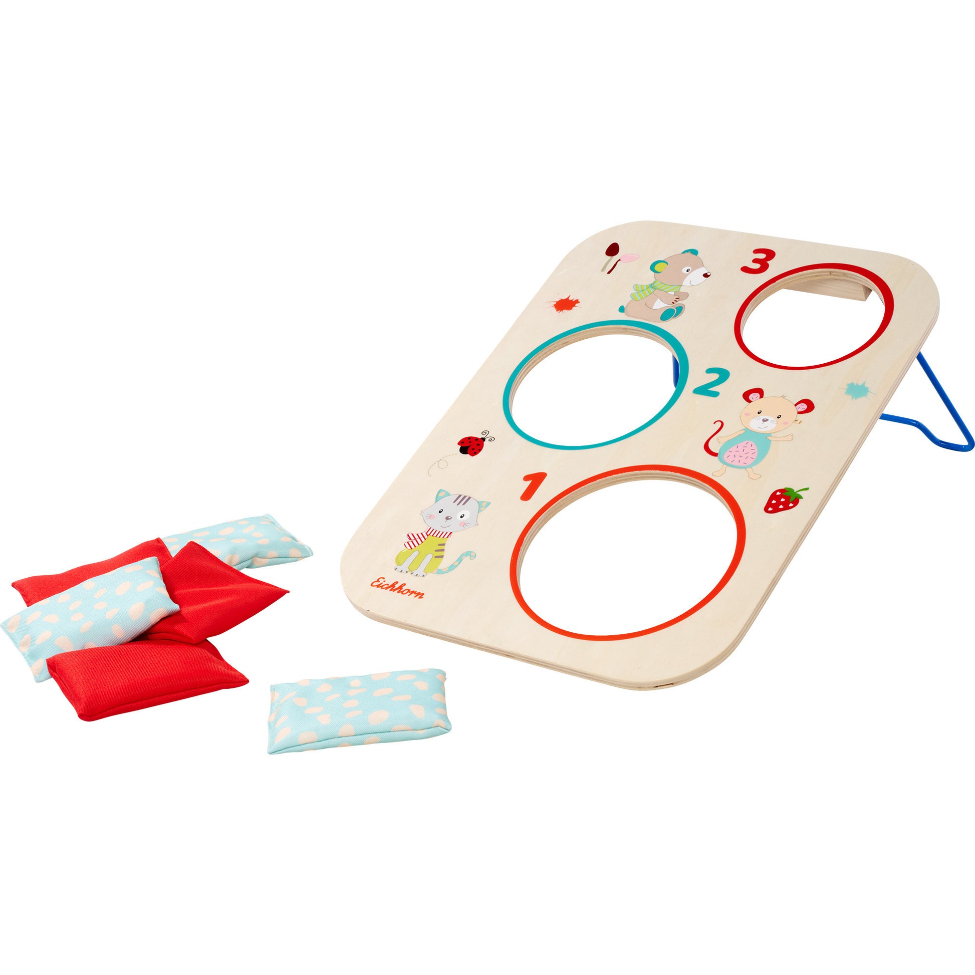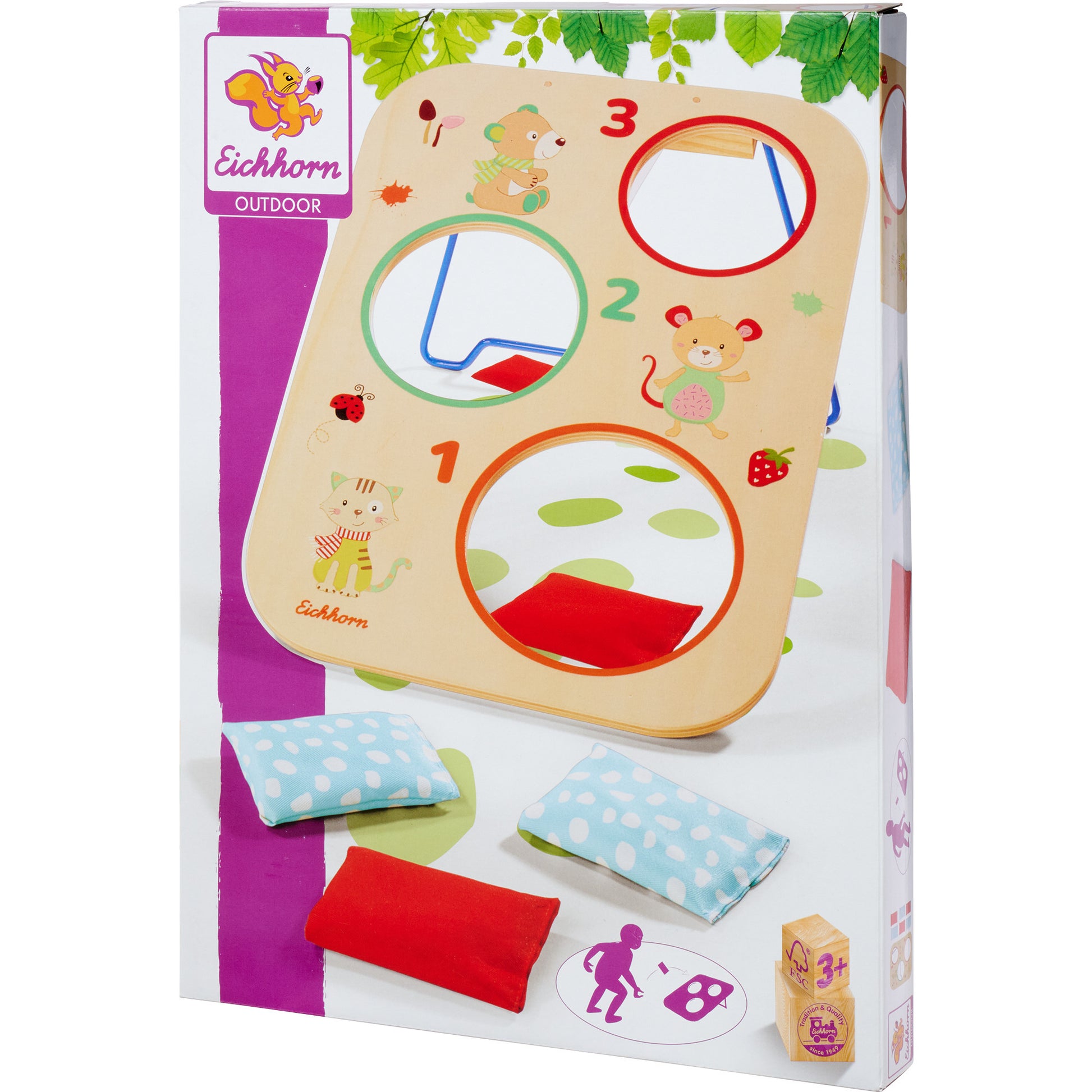 Das Eichhorn Wurfspiel ist das perfekte Geschicklichkeitsspiel für den Garten. Es besteht aus einem Spielbrett mit klappbarer Metallstütze und 6 Wurfsäckchen. Das Spielbrett hat drei Löcher in verschiedenen Grössen, die Löcher sind mit unterschiedlichen Punktzahlen gekennzeichnet. Das Wurfspiel kann entweder alleine oder zu zweit bespielt werden. Jeder Spieler wirft seine Säckchen, wer nach der festgelegten Rundenzahl die höchste Punktzahl hat, gewinnt das Spiel. Das Eichhorn Wurfspiel ist für Kinder ab 3 Jahren geeignet.