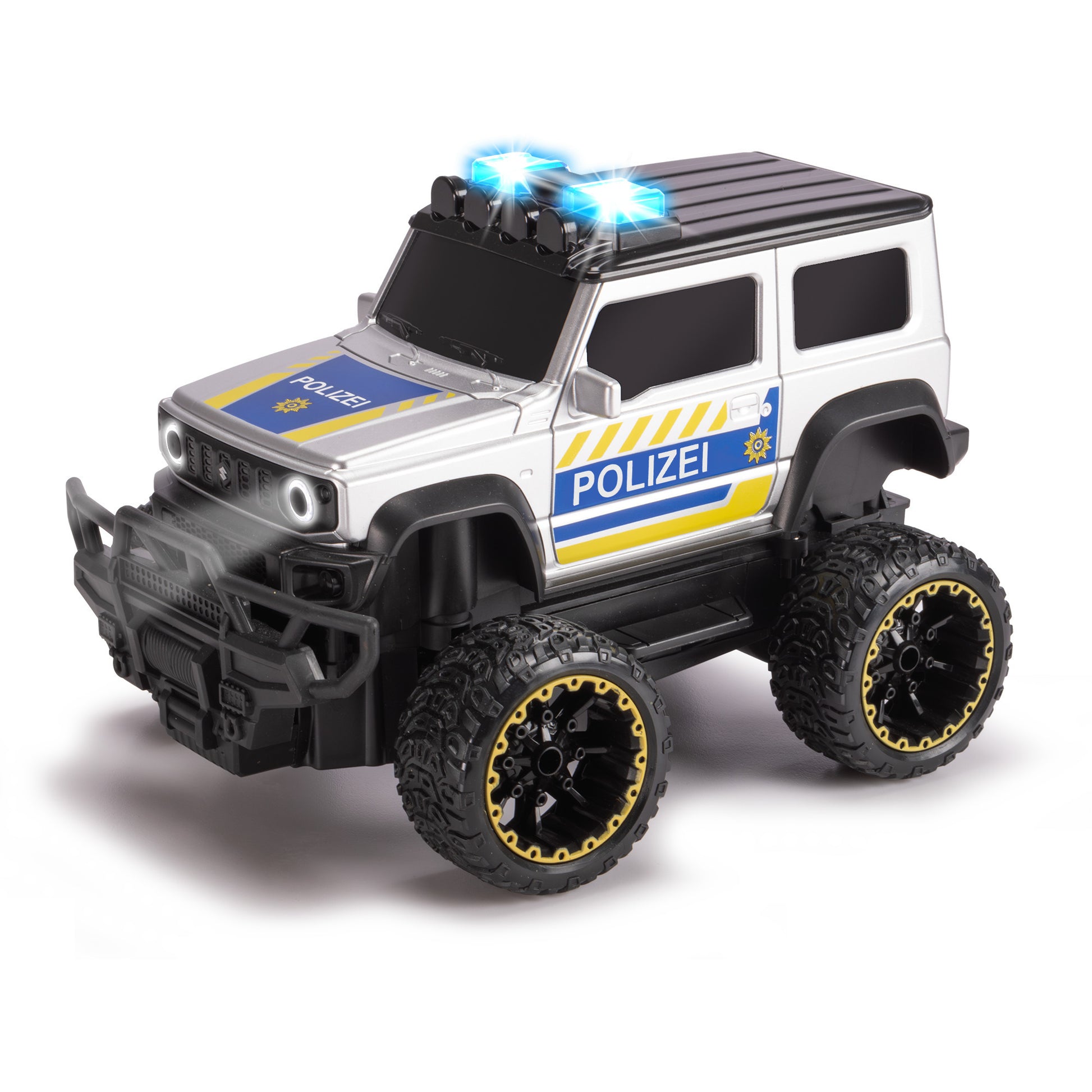 Mit Blaulicht und Sirene starten die Nachwuchs-Cops ihre Patrouille – oder eine actionreiche Verbrecherjagd! Das coole Polizeiauto mit Licht und Sound kombiniert die robuste Offroad-Performance des Suzuki Jimny Geländewagens mit deutschem Polizei-Design! Dank der kinderleichten Fernsteuerung in alle Richtungen behalten die Polizistinnen und Polizisten ab 3 Jahren die volle Kontrolle über das RC Spielzeugauto – und ihre Umgebung! Alle benötigten Batterien für das Einsatzfahrzeug und die Fernbedienung werden mitgeliefert. Das ferngesteuerte Polizei-Spielzeug punktet mit stabiler Bauweise, grossen Reifen und einer Höchstgeschwindigkeit von 8 km/h – ideal für die ersten Fahrabenteuer der Mädchen und Jungen. Blinkendes Blaulicht, LED-Scheinwerfer und eine zuschaltbare Sirene sorgen für realistisches Polizei-Feeling. Und wer es leiser mag, kann den Polizeiwagen-Sound einfach abschalten!