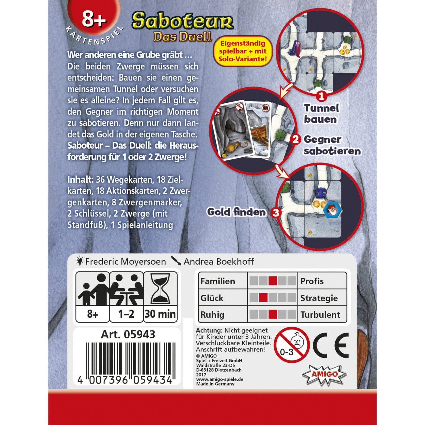 Die beiden Zwerge müssen sich entscheiden: Bauen sie einen gemeinsamen Tunnel oder versuchen sie es alleine? In jedem Fall gilt es, den Gegner im richtigen Moment zu sabotieren. Denn nur dann landet das Gold in der eigenen Tasche. Und fehlt es gerade an einem Mitspieler, versucht der eine Zwerg im Solospiel in drei Runden so viele Goldstücke wie möglich zu sammeln. "Saboteur - Das Duell": die Herausforderung für 1 oder 2 Zwerge!