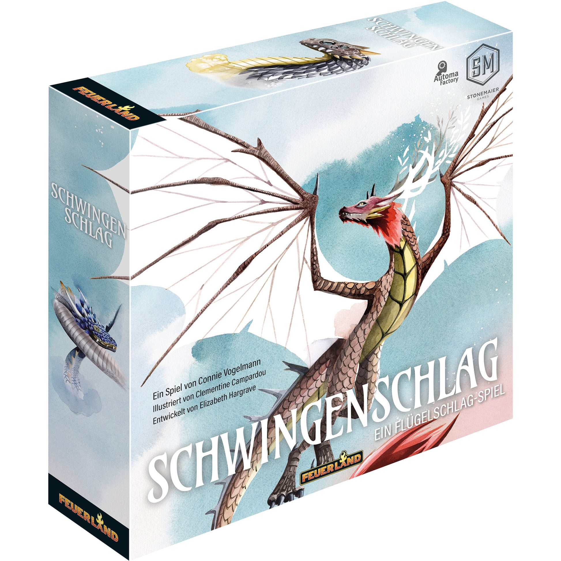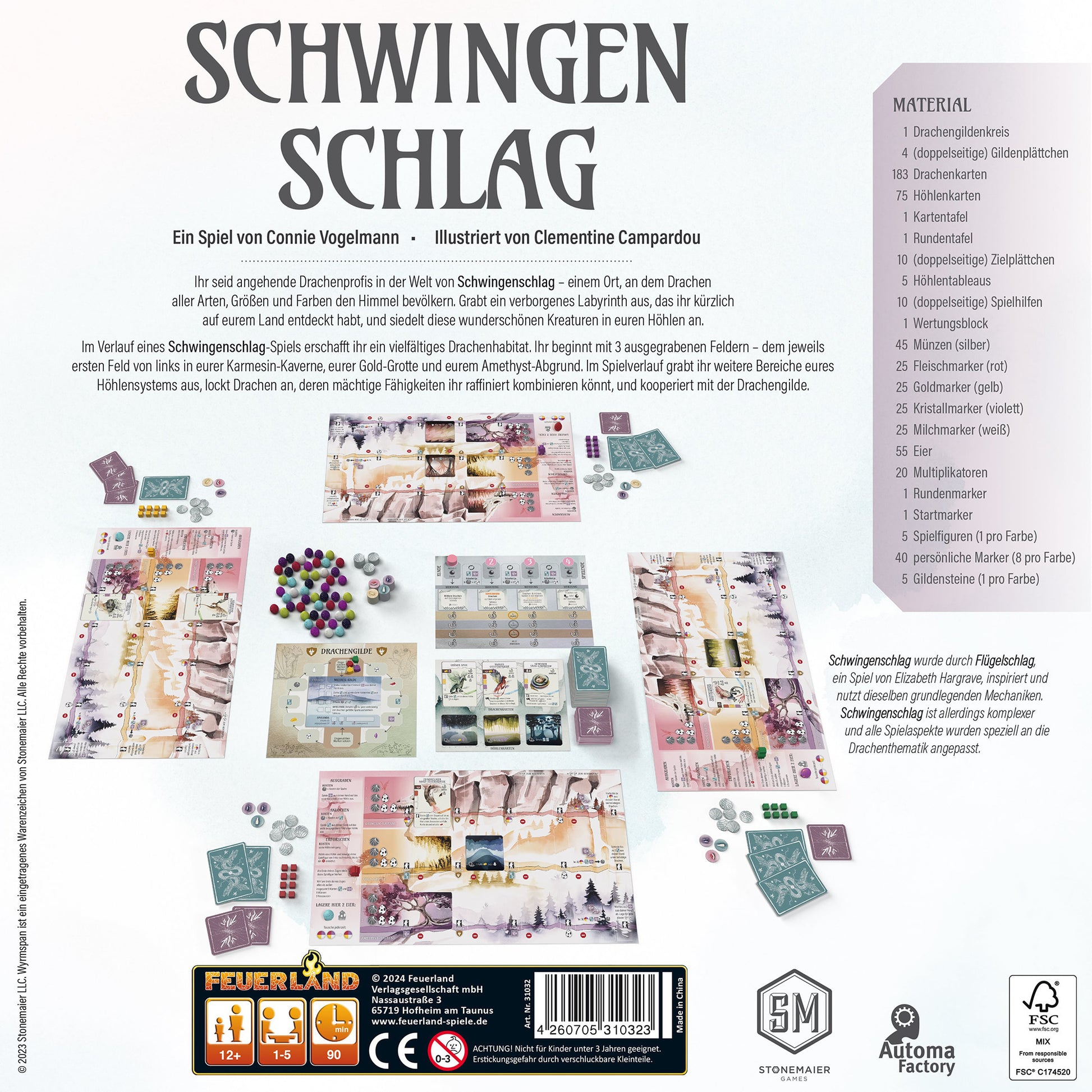In der Welt von "Schwingenschlag" bevölkern Drachen aller Arten, Grössen und Farben den Himmel. Während einer Partie grabt ihr ein verborgenes Labyrinth aus, siedelt dort Drachen an und erkundet die Höhlen. Arbeitet mit der Drachengilde zusammen und kombiniert die besonderen Fähigkeiten eurer Drachen. "Schwingenschlag2 wurde vom Spiel "Flügelschlag" inspiriert, ist allerdings etwas komplexer und die Spielaspekte wurden speziell an die Drachenthematik angepasst.