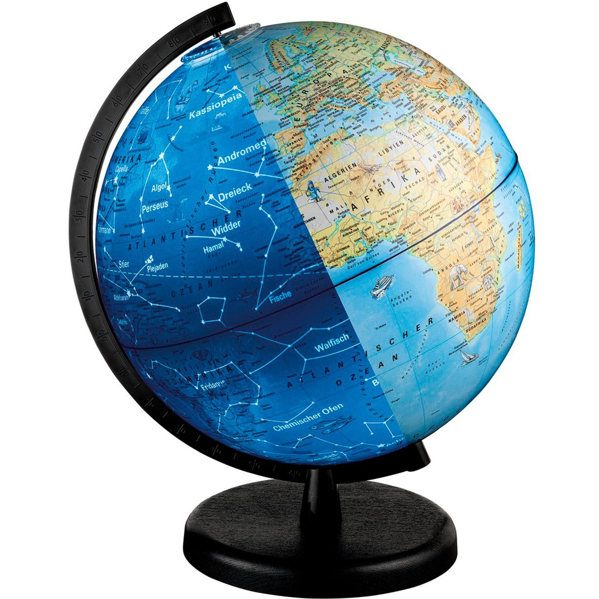 Bei Tageslicht zeigt dieser Kinderglobus von KOSMOS ein detailreiches und mit Illustrationen liebevoll gestaltetes Kartenbild der Erde. Mit einem Blick sind Ländergrenzen, Gebirge und Flüsse zu erkennen. Das Begleitheft enthält zudem spannende Infos zu den Superlativen der Erde, wie den höchsten Bergen, längsten Flüssen, kältesten Regionen und vielem mehr. Doch der Clou zeigt sich im Dunkeln! Beim Einschalten der Innenbeleuchtung erscheint ein Kartenbild mit den wichtigsten Gestirnen und Sternbildern und vermittelt so einen ersten Überblick über den Sternenhimmel. Im Begleitheft erfahren die Kinder die Hintergründe der Sternbilder und erhalten Tipps wie man sie am Nachthimmel entdecken kann.