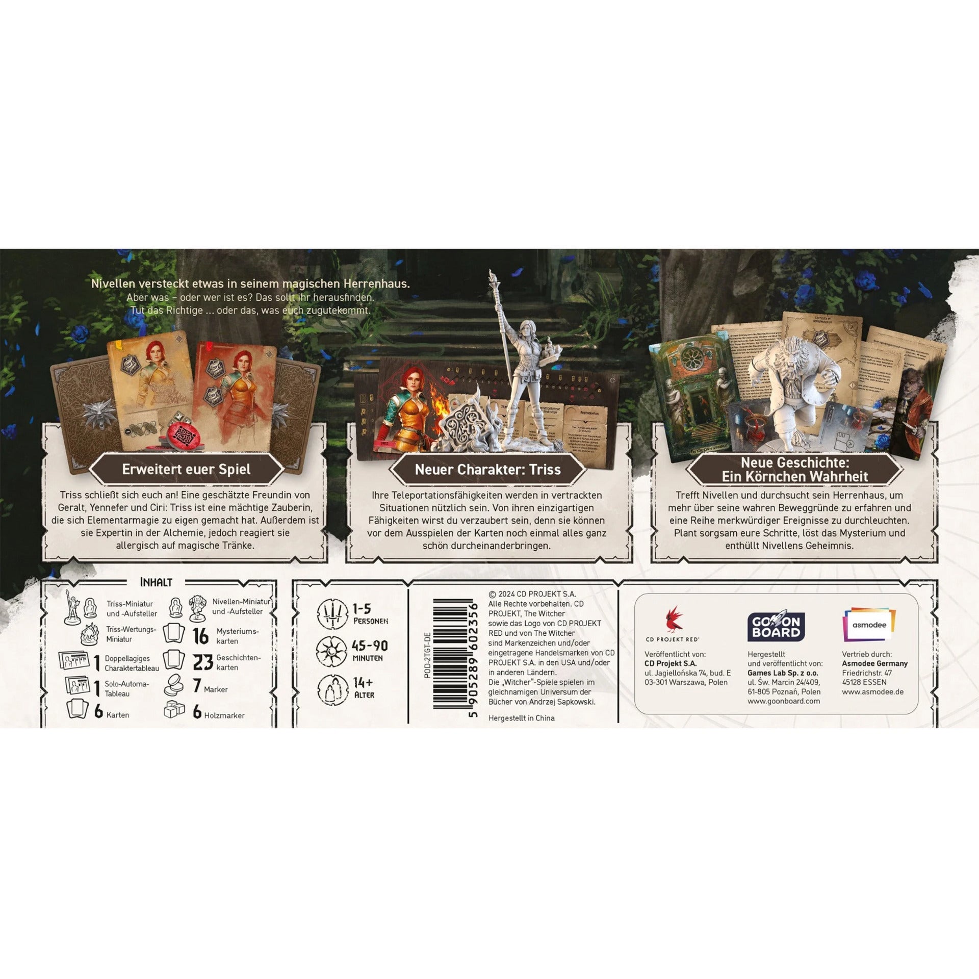 In der Erweiterung Triss & Ein Körnchen Wahrheit für das Kennerspiel The Witcher: Pfad des Schicksals schliesst Triss sich euch an. Eine geschätzte Freundin von Geralt, Yennefer und Ciri: Triss ist eine mächtige Zauberin, die sich Elementarmagie zu eigen gemacht hat. Ihre Teleportattionsfähigkeiten werden in vetrackten Situationen nützlich sein. Von ihren einzigartigen Fähigkeiten wirst du verzaubert sein, denn sie können vor dem Ausspielen der Karten noch einmal alles ganz schön durcheinanderbringen. In der neuen Geschichte Ein Körnchen Wahrheit trefft ihr Nivellen und durchsucht sein Herrenhaus, um mehr über seine wahren Beweggründe zu erfahren und eine Reihe merkwürdiger Ereignisse zu durchleuchten.