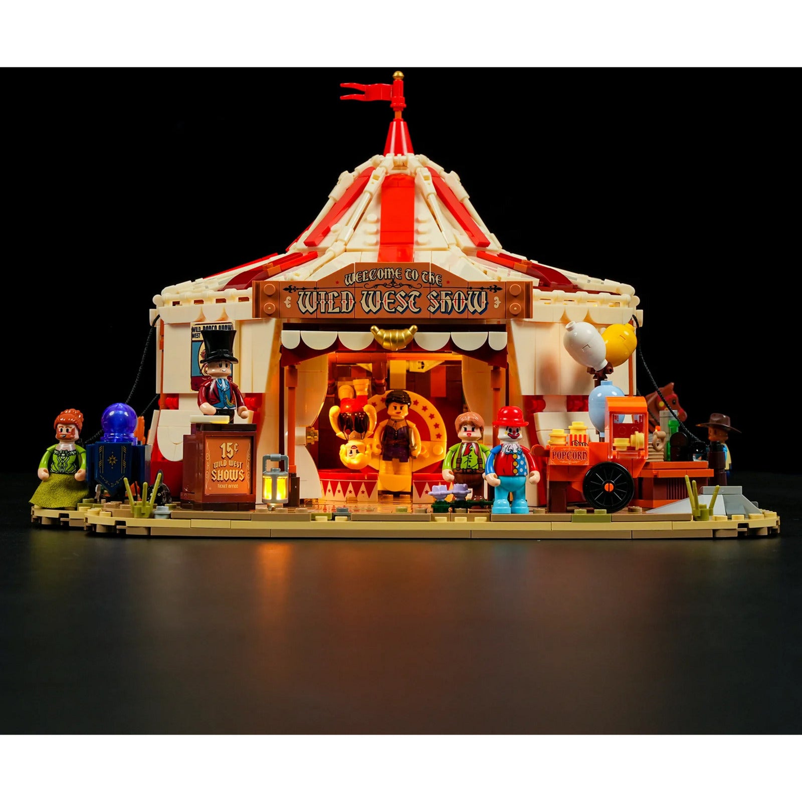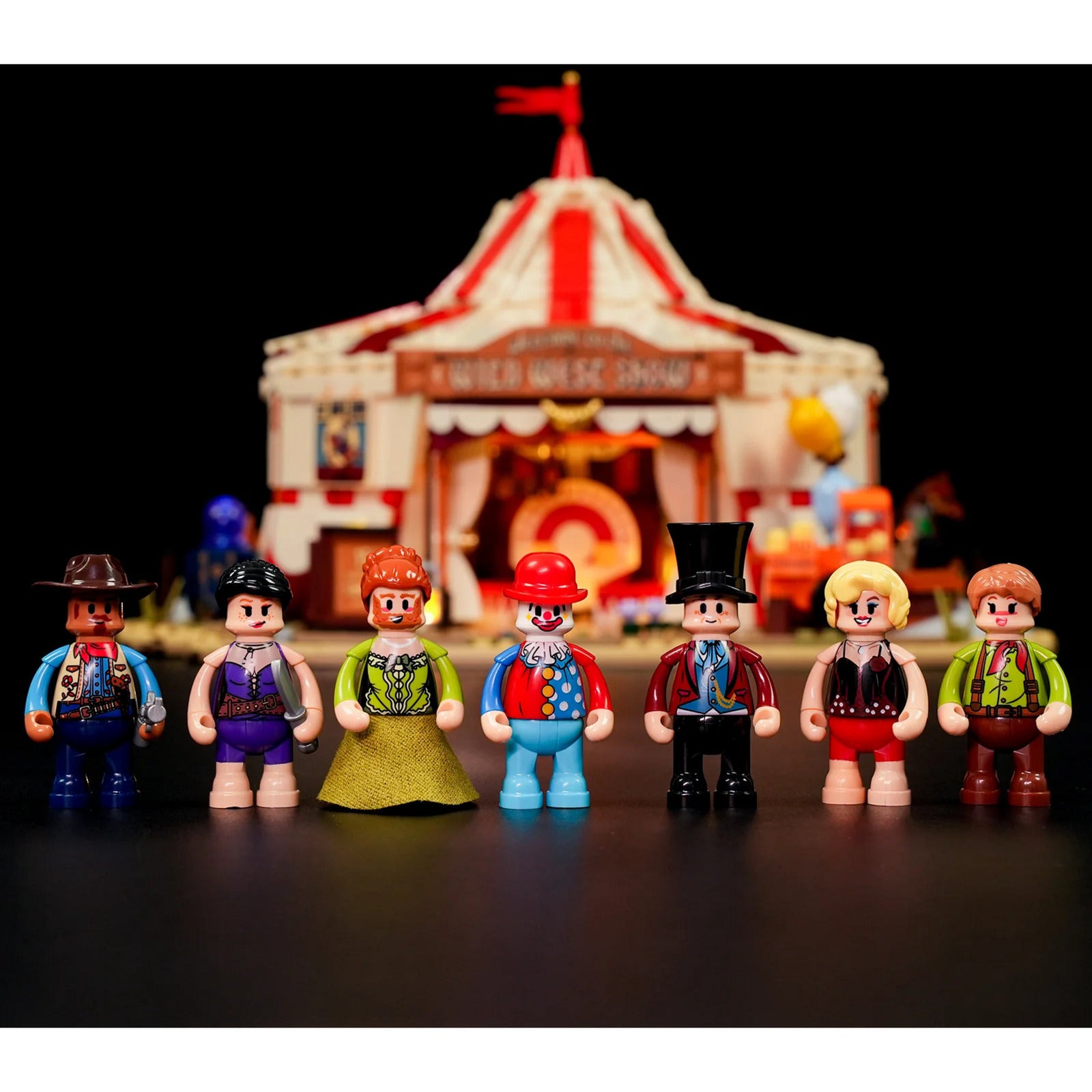 Lumibricks - das ist Klemmbaustein-Bauspass mit tollen Details und effektvoller Beleuchtung! Jedes Set bietet neben authentischer Gestaltung und passgenauen Teilen auch Beleuchtungszubehör, was das fertige Set im Dunkeln zu einem beeindruckenden Hingucker macht. Das gilt auch für die Sets der Wildwest-Serie: Mit dem Wanderzirkus erwacht die Klemmbaustein-Westernstadt zum Leben! Neben dem detailliert gestalteten Zirkuszelt gibt es hier viele tolle Attraktionen zu entdecken. Hinter dem Ticketschalter mit Zirkusdirekter gibt es eine Wahrsager-Station, einen Messerwerfer, einen Kunstschützen und vieles mehr zu entdecken. 7 LED-Leuchtelemente beleuchten dabei die Bühne und weitere Elemente wie die Kugel der Wahrsagerin. Viel Spass bei der nächsten Vorstellung!